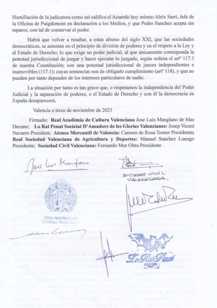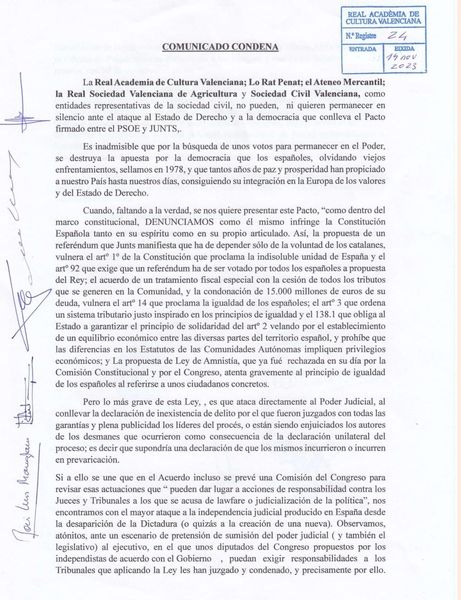 Davant la situació política actual, la Real Acadèmia de Cultura Valenciana, junt a Lo Rat Penat, l’Ateneu Mercantil, la Real Societat Valenciana d’Agricultura i Societat Civil Valenciana, desija fer públic el següent comunicat.