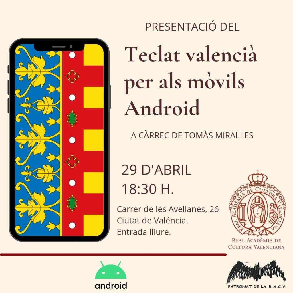 El pròxim dimarts 29 d’abril a les 18:30 es presentarà en el saló d’actes de la RACV (carrer Avellanes, 26, Valéncia ciutat) esta nova ferramenta digital que facilita l’us normal i habitual de la llengua valenciana en els teléfons mòvils i rets socials.